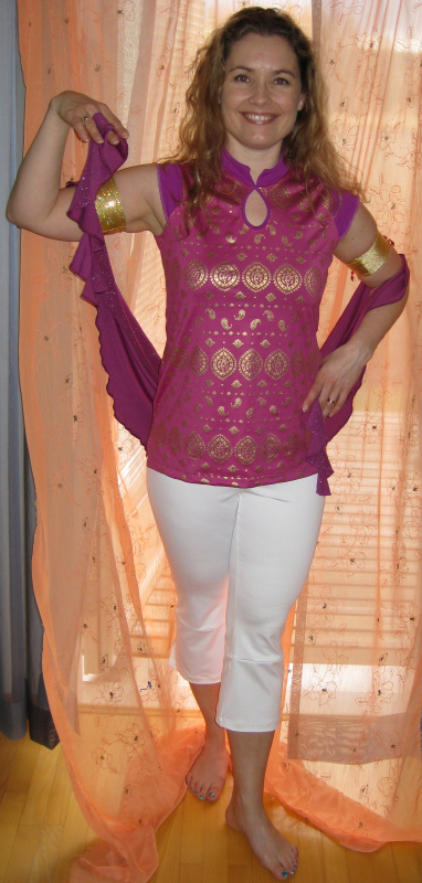 Bollywood-henkinen toppi 40e, kimalteleva lantiohuivi 18e,valkoiset caprit materiaalista riippuen 40-45e